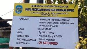 Perlu diketahui, Proyek Peningkatan Trotoar dan Drainase tersebut menelan biaya Rp. 269.373.000,00 menggunakan Dana APBD Kabupaten Nganjuk Tahun Anggaran 2024, dikerjakan Dinas Pekerjaan Umum dan Penataan Ruang (PUPR) Kabupaten Nganjuk melalui penyedia jasa CV. Arto Moro dengan waktu pelaksanaan 60 Hari Kalender.