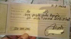 Keterangan tersebut diperkuat dengan bukti kuitansi pembayaran DP senilai Rp 20 juta tertanggal 10 September 2024. Dalam dokumen tersebut, tertera keterangan pembayaran untuk “DP alih nama sertifikat (tanah)” lengkap dengan tanda tangan penerima atas nama Kades JS.