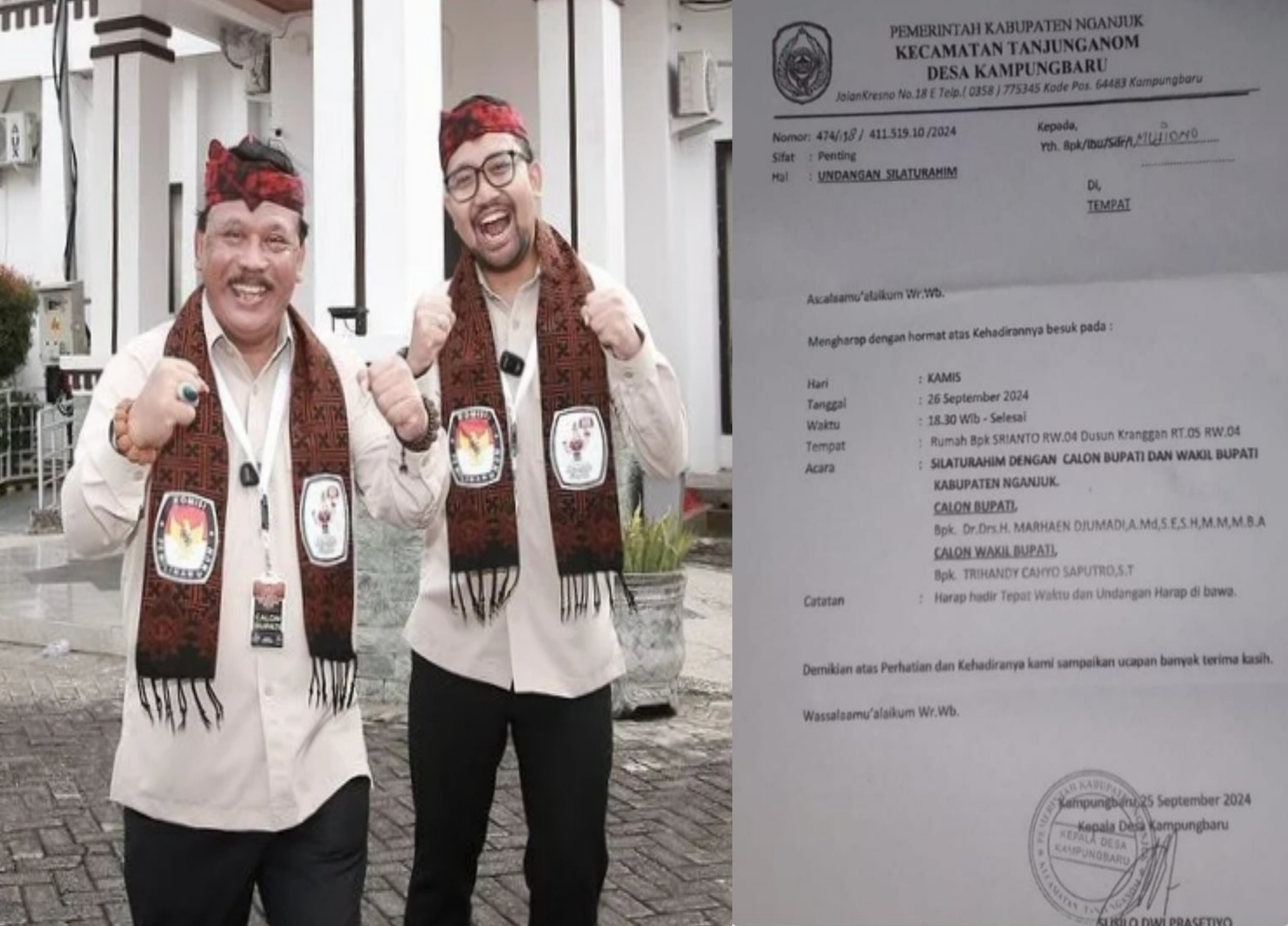 Dalam surat undangan tersebut bertuliskan bahwa Pasangan Calon (Paslon) Bupati dan Wakil Bupati Nganjuk akan mengadakan pertemuan silaturahmi bersama ratusan warga Desa Kampungbaru Tanjunganom di kediaman Ketua RW 04 (Srianto) Dusun Kranggan Desa Kampungbaru pada 26 September 2024 pukul 18.30 WIB, dengan menggunakan Kops dari Kecamatan dan Desa, serta Tandatangan stempel Kepala Desa (Susilo Dwi Prasetiyo).