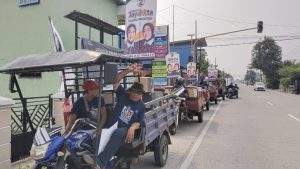 Ribuan kendaraan bermotor berkeliling kota, mengiringi aksi kampanye serentak yang melibatkan armada ledang dan pasukan becak motor.